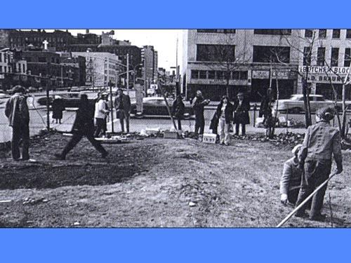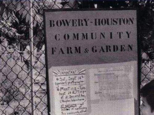 In the spring of 1973, the tide began to change. College students and artists had recently been moving into the Bowery to take advantage of low rents, and one new resident, Liz Christy, saw the vacant lots filled ten feet high with trash as both a danger to the community and an opportunity for change. She brought in a group of friends, and together they started cleaning up an abandoned lot and turning it into green space. They spent the next three months hauling trash, leveling the gravel underneath, and trucking in fresh soil. Using horse manure from a nearby mounted police station as fertilizer, they made sixty raised garden beds, and began planting. The neighbors, mostly Hispanic and African-American, were initially skeptical, but soon they started pitching in with both work and their ideas about what they needed from a garden.