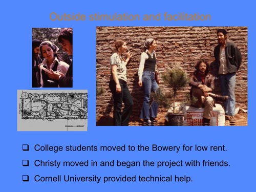 - Outside stimulation and facilitation. Outsiders can be a source of fresh ideas. While action at the local level is essential, a success story typically begins when people or information from outside a community stimulate a shared awareness about a problem and introduce game-changing ideas for how to deal with it. Artist Liz Christy was a newcomer to the rundown Bowery neighborhood, and there was an influx of young college students seeking lower rents in an otherwise expensive city. Christy brought in a group of friends to help clean a single vacant lot and turn it into a garden. People had wanted to do something like this, but needed a "spark" to get it going. Once the community gardening movement was underway, Cornell University (New York's Land Grant college) provided technical support for expanding the gardening network.