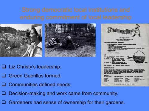 - Shared community awareness and commitment. Strong democratic institutions and genuine community participation are prominent in EcoTipping Point stories. Of particular importance is a shared understanding of the problem and what to do about it, and shared ownership of the action that follows. Communities move forward with their own decisions, manpower, and financial resources. The Green Guerillas, helped different neighborhoods to organize and design their own green spaces, depending upon their preferences (e.g., neighborhoods with many children or with many elderly people; or neighborhoods with ethnic groups who wanted to grow vegetables not available in local stores). Over the years it was discovered that gardens created by outside agencies (e.g. the Department of Housing and Urban Development) and then handed over to local residents fell into disrepair after a short time. Only those in which decision-making and leadership emerged from the community were successful. In contrast to public parks, people developed a sense of ownership in gardens where they themselves worked. People say to themselves, "I planted that tree, I put in that bench, I grew this zucchini." After community organizations were successful with gardens, they expanded their attention to many other projects to improve their neighborhoods.