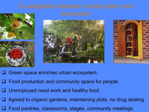 - Co-adaption between social system and ecosystem. Social system and ecosystem fit together, functioning as a sustainable whole. Communities create a "social commons" to fit their "environmental commons." By working as a community, neighborhood residents were able to create a healthier urban environment. The idea of community gardens fit well with an urban population in need of green space and places to congregate and socialize. Many people were also unemployed and in need of work and healthy food. As the neighborhood ecosystem changed, people began to recognize it as a source of nutrition. As neighborhood quality improved, people began to take pride in it and dedicated themselves to improving it even further. Garden rules were important (e.g., no drug dealing, respect for others, maintaining an active garden in one's assigned plot, and using organic methods), as well as penalties for breaking the rules, which were mild for small infractions and stronger for more serious infractions. The gardens evolved to fulfill more social needs: food pantries, community organizing, stages for performances, classrooms.