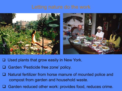 - "Letting nature do the work." EcoTipping Points give nature the opportunity to marshal its self-organizing powers to set restoration in motion. Plants were chosen that grew well in New York without intensive artificial inputs. Manure from police horses and compost from local households provided natural fertilizers, ensuring high soil quality and making it unnecessary to use chemical fertilizers. While starting a garden is labor-intensive, once nature took over it produced many benefits that might have cost even more labor: reducing crime; providing food; improving environmental quality and the appearance of the neighborhood; creating a community meeting place.
