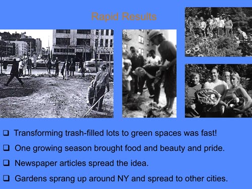 - Rapid results. Quick "payback" helps to mobilize community commitment. Removing the garbage from a vacant lot and creating a green space took only a few weeks or months. Small, early successes, such as delicious food and attractive flowers, stimulated further efforts toward success. One growing season was enough to have an impact on the local neighborhood. A prominent article in the newspaper spread the idea, and other gardens began to spring up through local community effort. These in turn inspired others. The community garden movement spread to other U.S. cities (e.g., Boston and Chicago) and even to European cities (London, Paris, Rome).