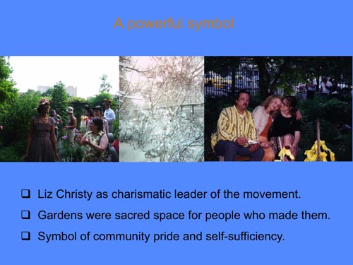 - Community gardens in New York City reversed a vicious cycle of urban decay, crime-ridden empty lots, neglect, and population flight, while producing food, flowers, and wildlife habitat. These gardens nourished the bodies and souls of 800 neighborhoods, and inspired urban community gardening across the nation.