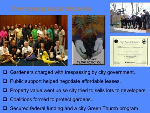 - Overcoming social obstacles. The larger socio-economic system can present numerous obstacles to success on a local scale. Initially the "guerilla gardeners" were threatened with trespass charges and evictions for occupying vacant lots. To the city government, the concept of the public taking over property was alien. But the gardeners were able to rally public opinion and eventually to negotiate very affordable leases. Years later, when property values increased, developers began to eye the "vacant" lots, and the city started to sell them, the gardeners were able to form a coalition to secure the long-term status of most of the gardens. Later, federal funding and the city's Green Thumb program strengthened the community gardens movement.