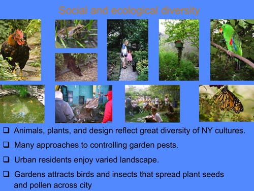 - Social and ecological diversity. Diversity provides more choices, and therefore more opportunities for good choices. Because the gardens were managed by neighborhood organizations, they reflected the great diversity of cultures in New York City. The Hispanic gardens had chickens and goats; the Chinese gardens had religious symbols. The neighborhoods also developed various approaches to problems such as garden pests. Ecologically, a more diverse landscape is more pleasing for the urban residents. Besides introducing a variety of useful and colorful vegetation where once only weeds grew, the gardens attracted birds and insects that served as pollinators for plants throughout the city.