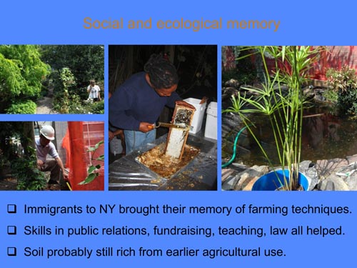 - Social and ecological memory. Learning from the past adds to the diversity of choices, including choices that proved sustainable by withstanding the "test of time." For example, the early gardens in low-income neighborhoods reflected a diversity of cultural heritages. Immigrants from the Caribbean and African Americans from the South put their "social memory" to work, recreating gardens that featured the flavors of home. Not only farming techniques, but also skills that the gardeners brought from varied backgrounds – such as public relations, fundraising, teaching, law, and other professions – contributed to the gardens' success. Ecologically, the soil, which had been used to produce crops in earlier centuries, may have retained some of its agricultural capacity from earlier years.