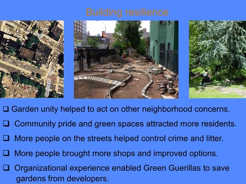 - Building resilience. "Resilience" is the ability to continue functioning in the face of sometimes severe external disturbances. The key is adaptability. The gardens were sacred public spaces, where (unlike a vacant lot) it was "taboo" to dump trash. The community solidarity and social cohesion that developed around them allowed residents to defend their gardens and to take action on other issues affecting their neighborhoods such as crime and trash. A positive feedback loop developed in which better neighborhood quality led to more community pride and commitment, and attracted more residents. More people on the streets reinforced control of crime, illegal dumping, etc. and stimulated more shops to open, which in turn improved neighborhood quality. As some of the neighborhoods evolved from low-income to higher-income districts, the gardens evolved to include low-maintenance plants as a place to relax rather than grow food. When the city government started to sell off garden lots to developers, the gardeners had the experience, neighborhood pride, organization, and confidence to engage successfully in the public opinion and legal battles that saved most of the gardens.
